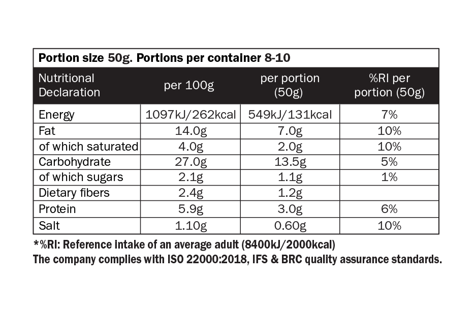 Spinach 42%, onion, whey cheese (myzithra) 8.5%, feta cheese P.D.O. 8.5%, mixture vegetable oils (corn oil, pomace oil and virgin olive oil, sunflower oil), breadcrumbs wheat [wheat flour, water, whole wheat flour, rye flour, yeast, salt, barley malt flour, sugar, emulsifier (diacetyltartaric and fatty acid esters of glycerol), antioxidant (ascorbic acid)], pasteurized egg, salt, dill, garlic powder.